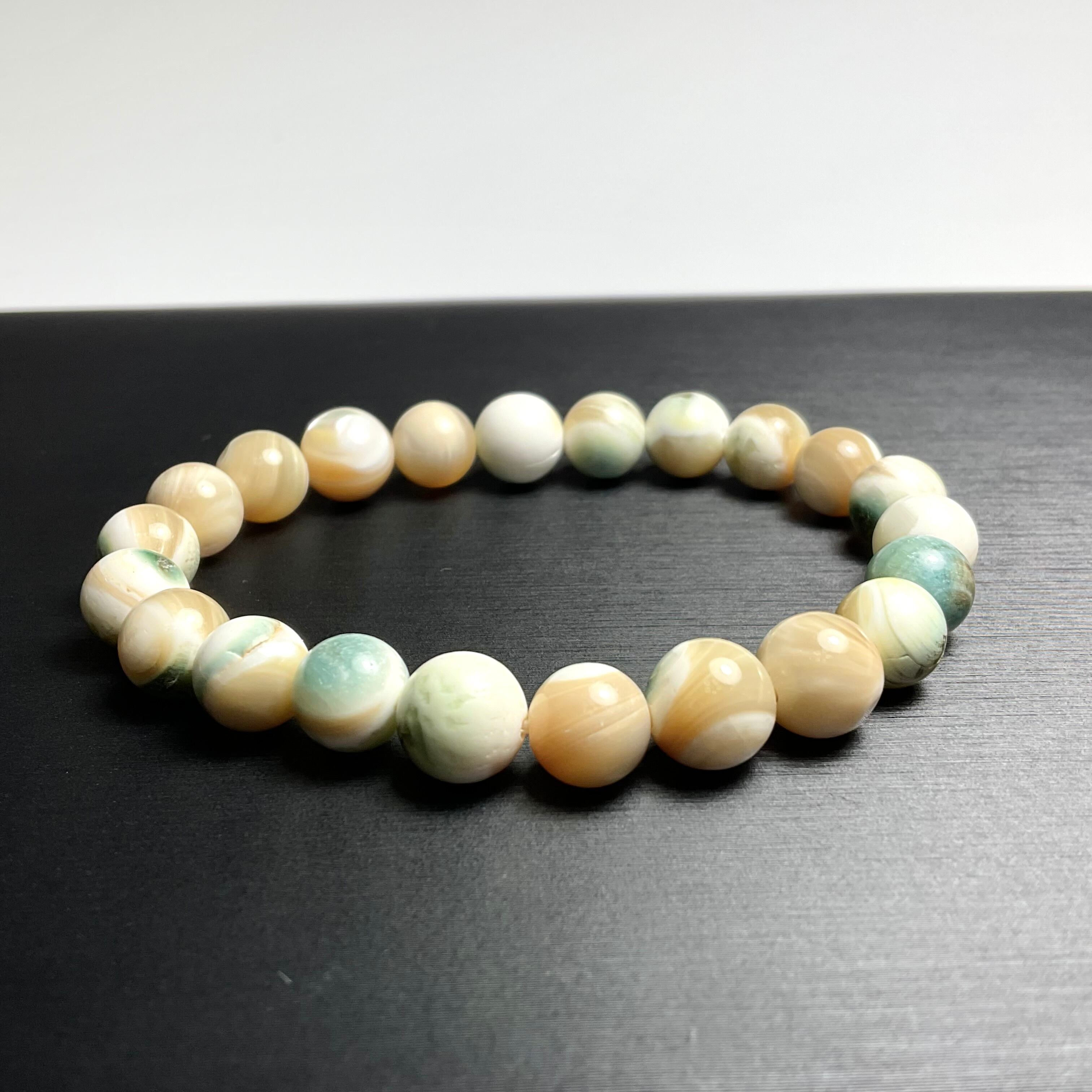 ホワイトとベージュのお色にグリーンが入った夜光貝のブレスレットです。
