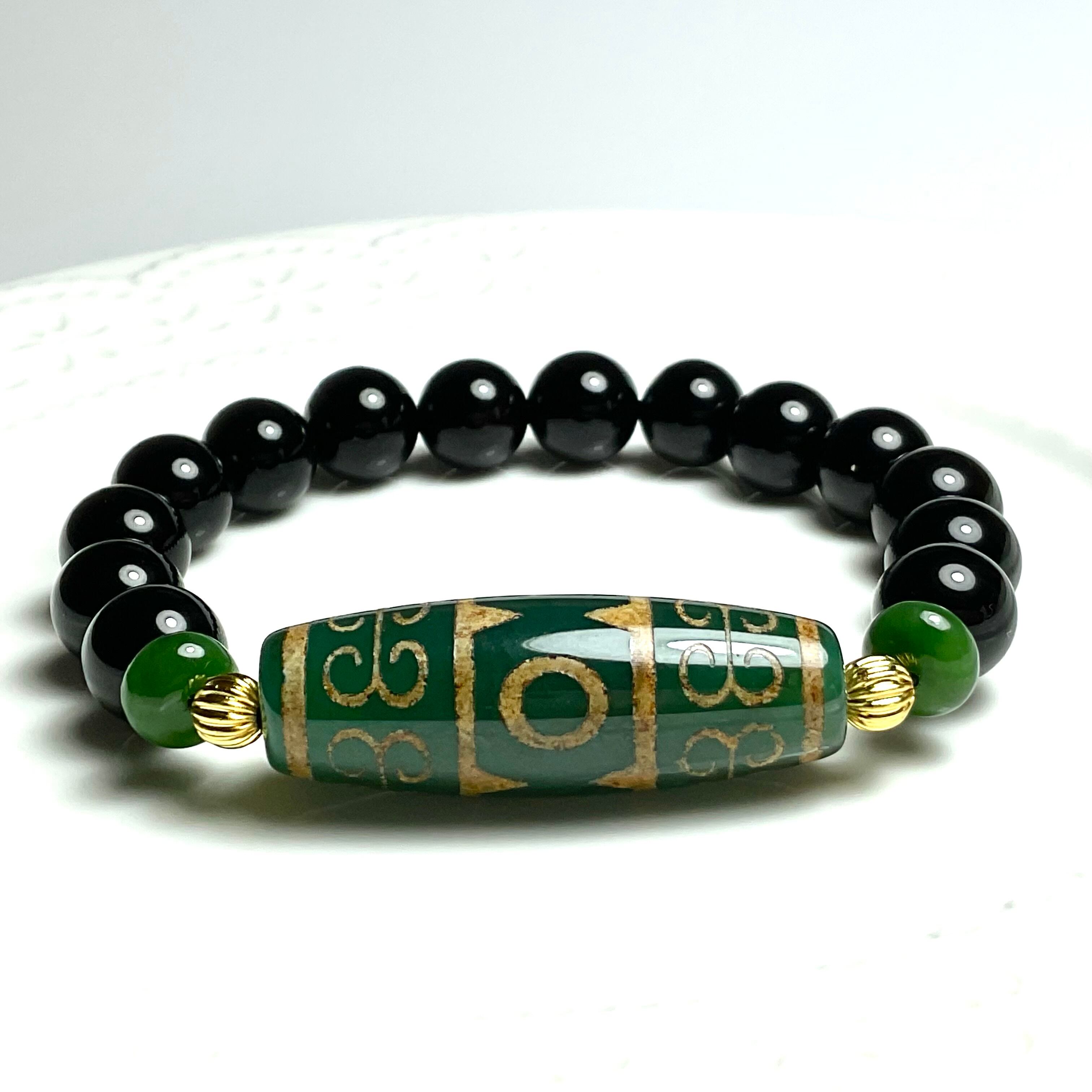 緑龍紋天珠・回紋虎牙三眼天珠と魔除けの石10mmのオニキスのブレスレット✨✨