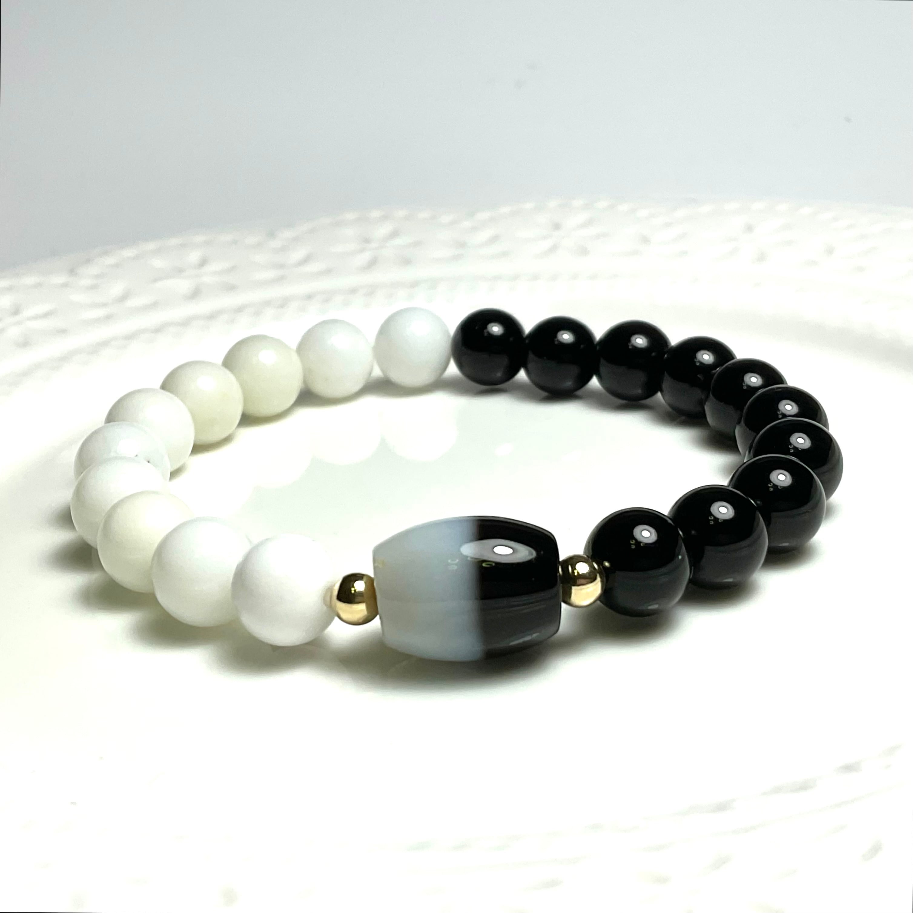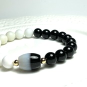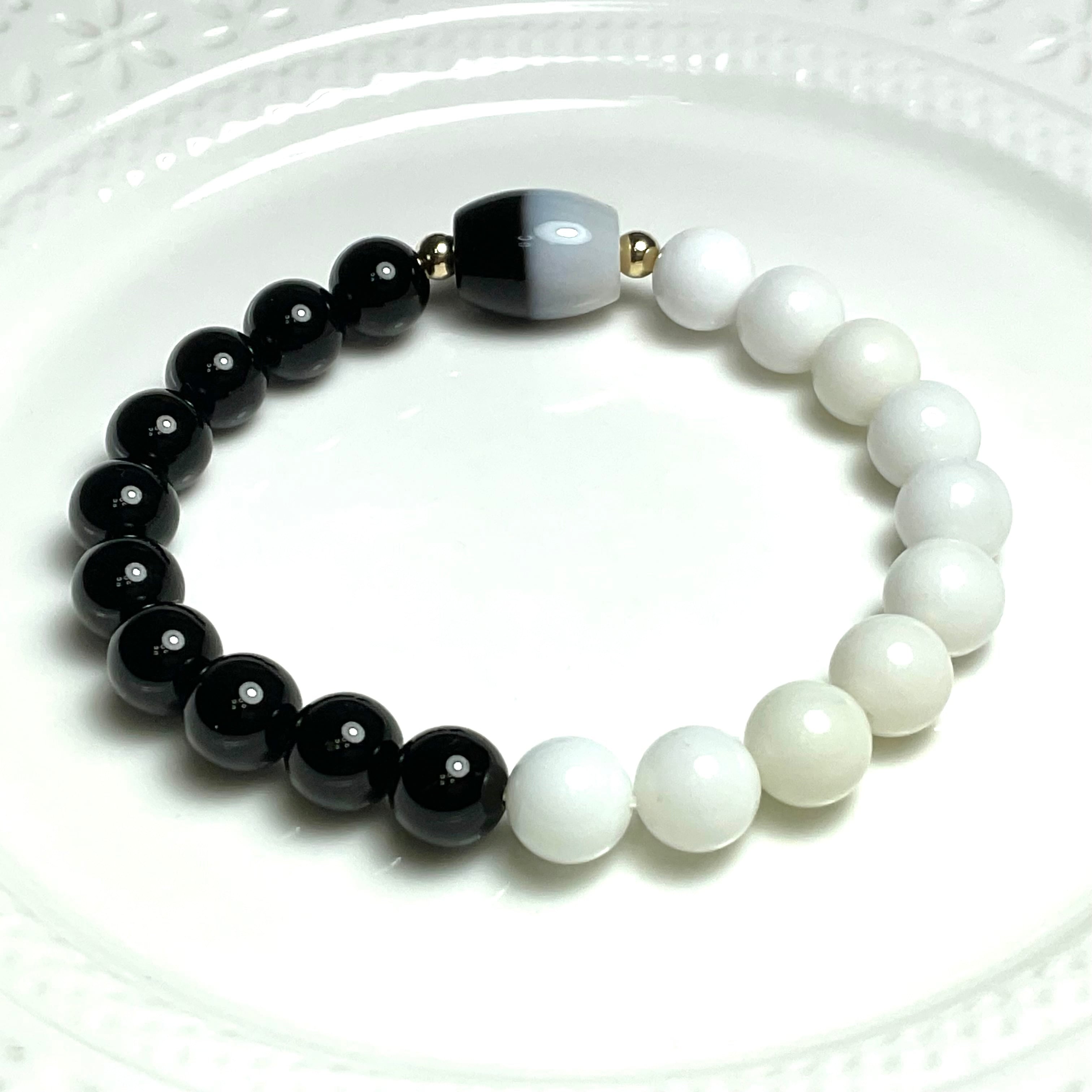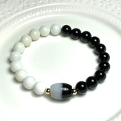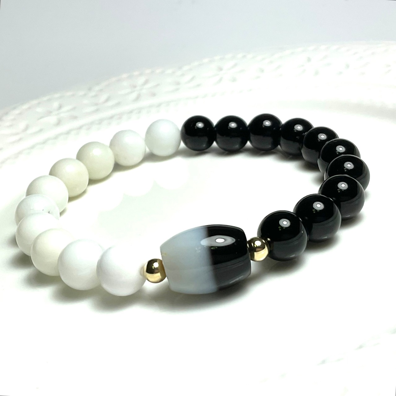小さめの黒白天珠と白いホワイトオパールとオニキスのバイカラーのブレスレット。