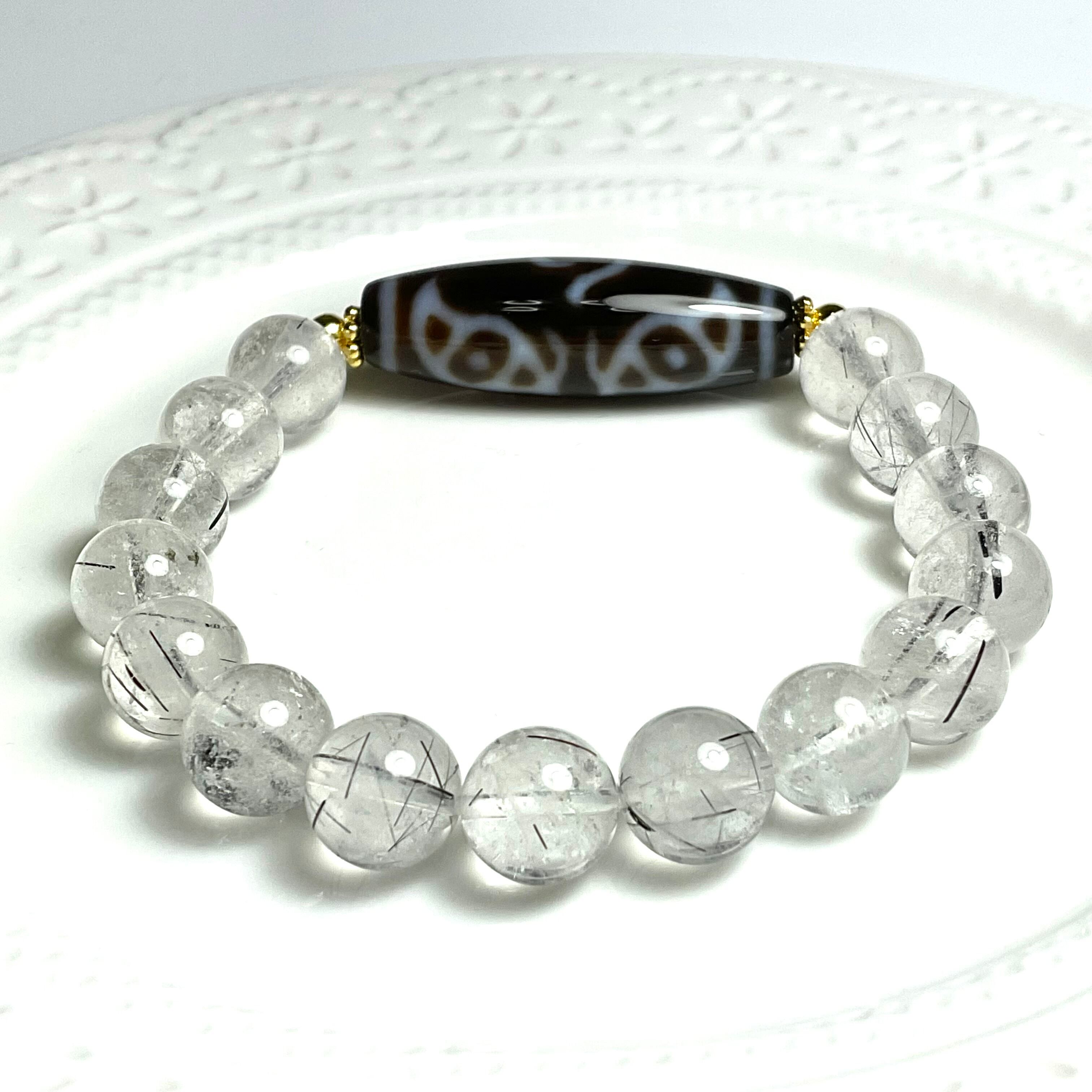 佛龍眼梵字の天珠とブラックトルマリンインクォーツのブレスレット❣️❣️