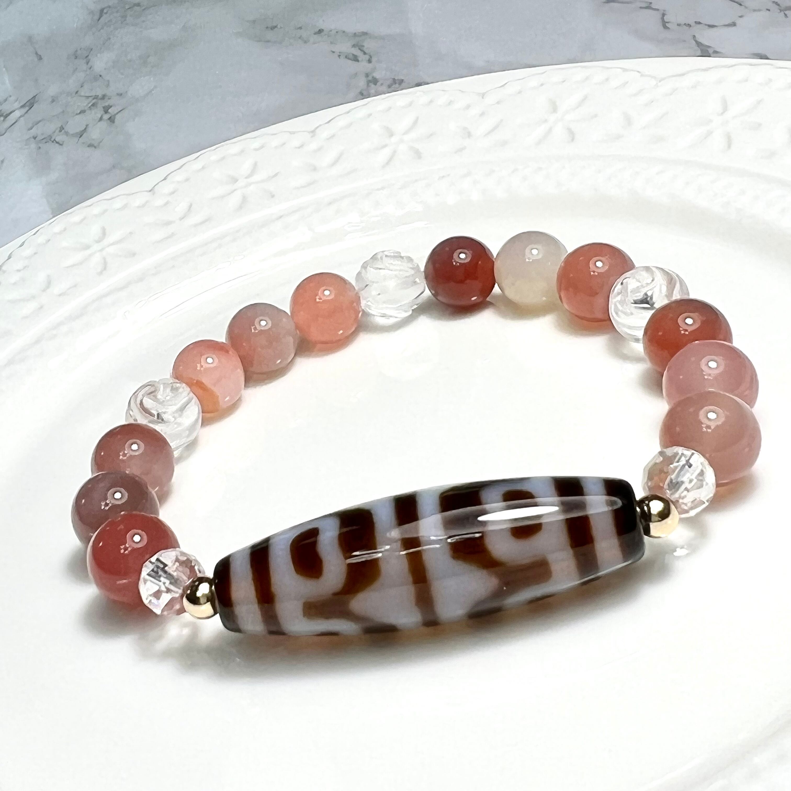 虎牙蓮花天珠と天然塩原瑪瑙とと薔薇彫り水晶ののブレスレット❣️❣️