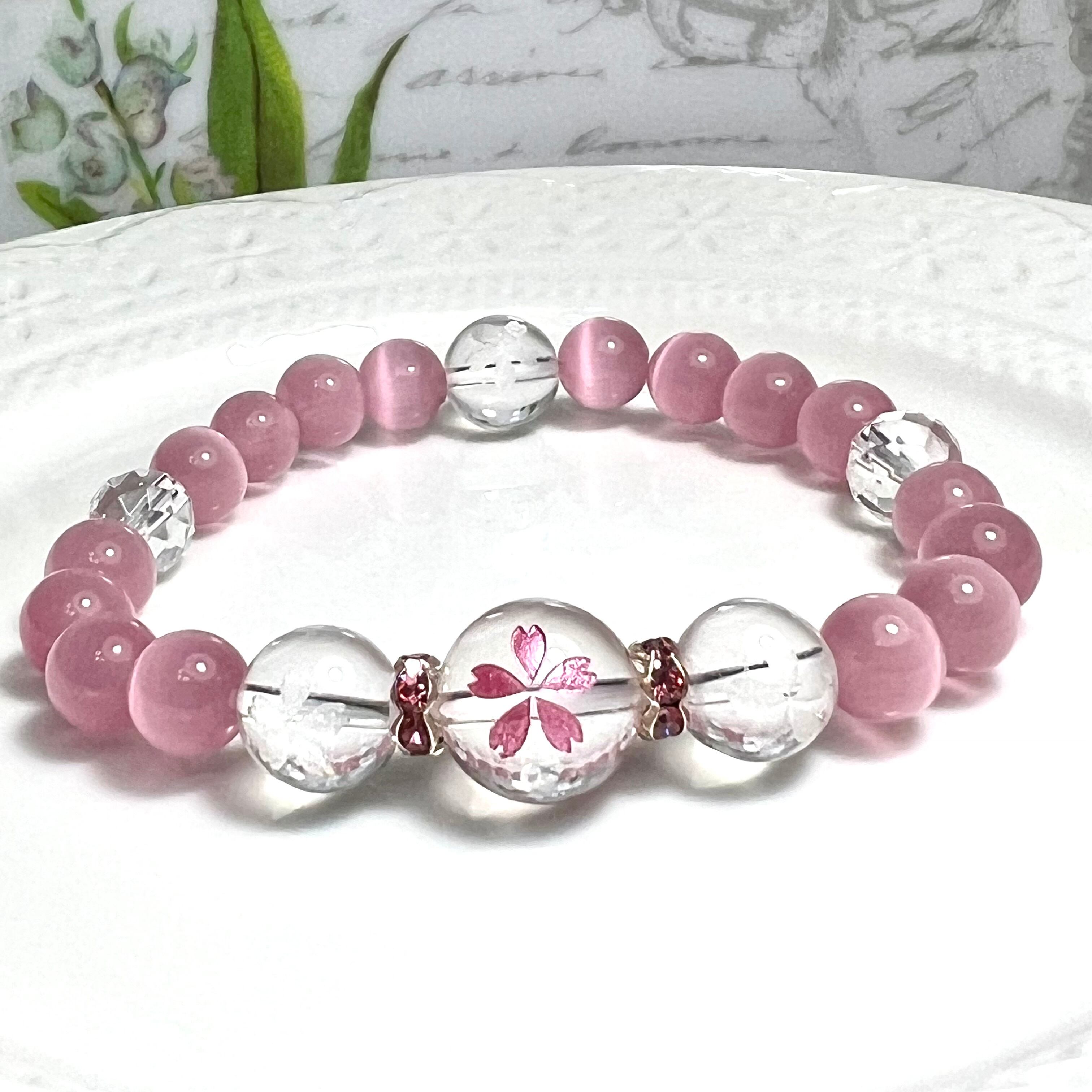 12mmの桜彫り水晶と桜の素彫り水晶とピンクキャツアイのブレスレット❣️❣️