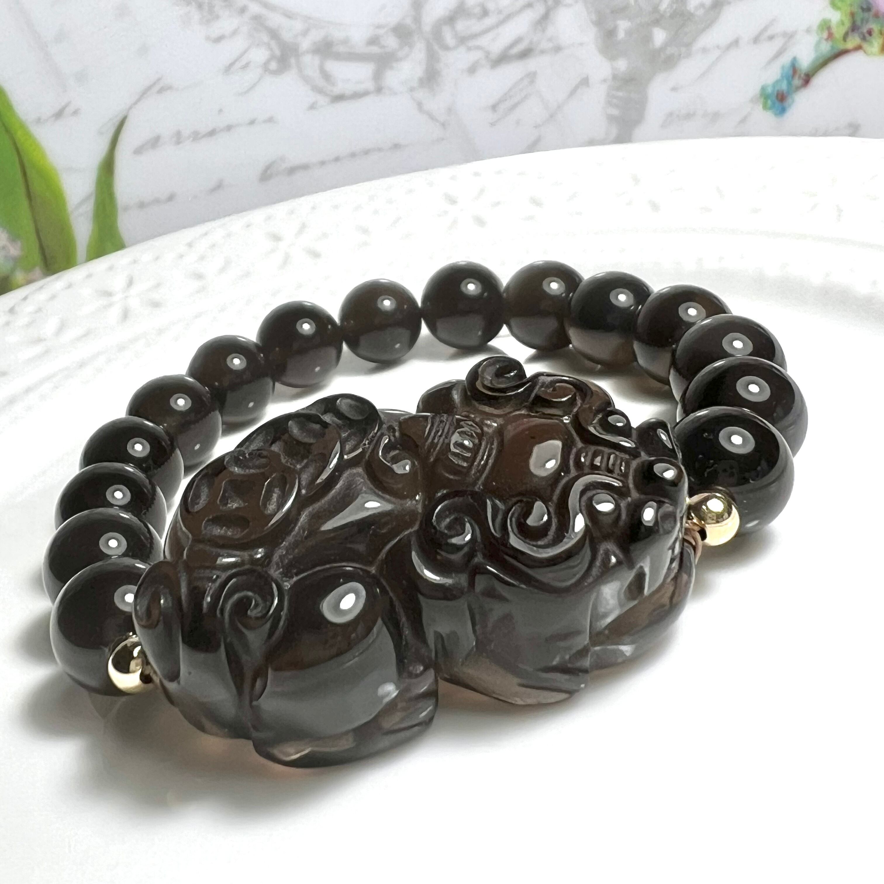 かすかに透明感のある濃いブラウンのアイスオブシディアンの貔貅のブレスレット。