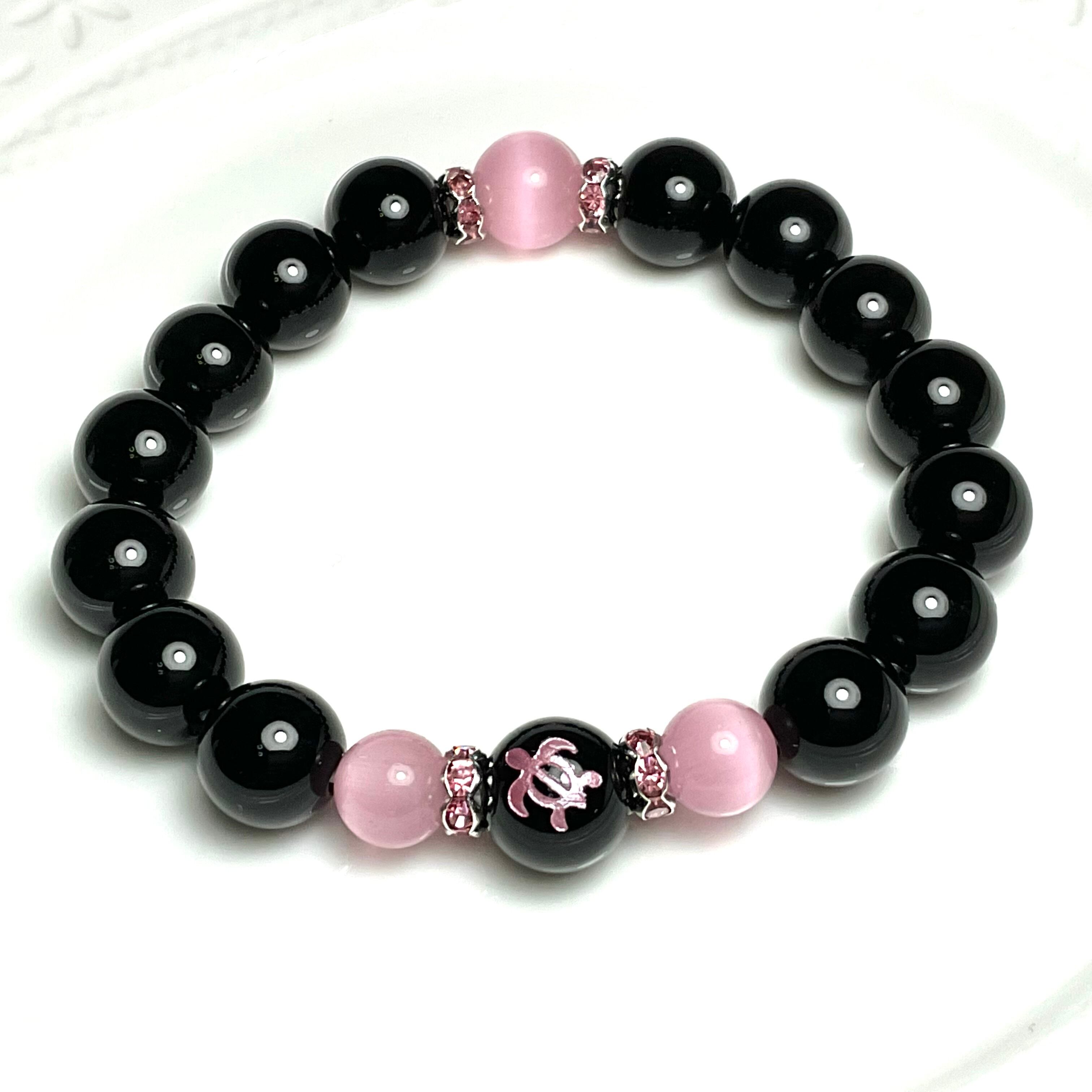 10㎜*ピンクのホヌ彫りのオニキスとピンクキャツアイのブレスレット❣️❣️